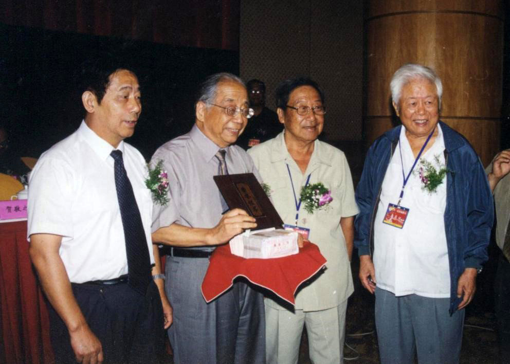 文化部原代部長、著名詩人賀敬之(右二),原中華詩詞學會會長孫鐵青(右一),紅豆集團創始人周耀庭(左一)為劉征(左二)頒獎