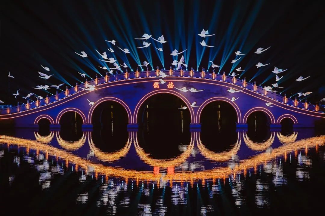 2018年,央視七夕晚會(huì)首次在南北兩個(gè)會(huì)場(chǎng)平行推進(jìn),南依然是江西新余仙女湖,北則選了有著深厚七夕節(jié)文化淵源的陜西西安昆明池。一臺(tái)晚會(huì),“南北共此夕”,南方的溫柔婉約和北方的古樸大氣在這里交相輝映;一座鵲橋,牽起南與北,為舞臺(tái)增添了一份穿越時(shí)空對(duì)話的美感。兩地得天獨(dú)厚的自然景觀,令整臺(tái)晚會(huì)以天為幕、山為景、水為臺(tái),形成一幅情景交融的藝術(shù)山水畫。