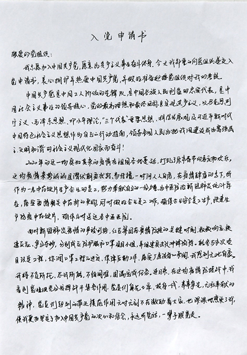 紅豆集團(tuán)國(guó)際公司的員工梁艷的再次向黨組織遞交入黨申請(qǐng)書的原因很簡(jiǎn)單,“為了支持一線疫情防控,集團(tuán)緊急組建黨員突擊隊(duì)支援防護(hù)服、口罩生產(chǎn)線,負(fù)責(zé)最緊急、最艱苦的工作。我也報(bào)名了,因我還不是黨員,所以沒(méi)有把最重的任務(wù)安排給我。”受到身邊黨員的激勵(lì),讓梁艷鼓起勇氣,擬出了這份“疫情火線入黨申請(qǐng)書”。