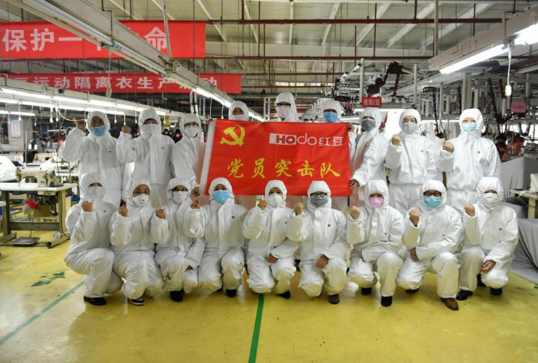 我還在所有車(chē)間都打上了這樣一句標(biāo)語(yǔ):“為黨為國(guó)為人民,紅豆要爭(zhēng)分奪秒”,增加全員的使命感和緊迫感。集團(tuán)黨委也開(kāi)展了“戰(zhàn)疫復(fù)產(chǎn)先鋒”活動(dòng),筑牢紅色堡壘。我清楚記得:2月1日連夜成立防護(hù)服項(xiàng)目指揮部!2月3日首套民用防護(hù)服就成功下線!2月7日隔離衣項(xiàng)目首件順利下線!2 月 11 日首批 10 萬(wàn)只日常防護(hù)型口罩順利下線!2月17日紅豆醫(yī)用防護(hù)服獲批量產(chǎn)!2月24日醫(yī)用防護(hù)服車(chē)間擴(kuò)產(chǎn)改造項(xiàng)目正式交付。紅豆人爭(zhēng)分奪秒加急生產(chǎn)防疫物資,為戰(zhàn)勝疫情貢獻(xiàn)“紅豆力量”。