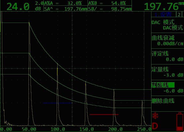 - 內置國內主要4個探傷標準,可直接通過選取標準、試塊、探傷等級自動設置DAC曲線的三線偏移量,內帶“美國 鋼結構焊接規范焊縫分級AWS D1.1”評定標準,使檢測更加得心應手,方便現場使用。(下圖為DAC曲線圖)
